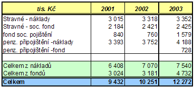 Stravné – hrazené částečně z nákladů a částečně ze sociálního fondu – představuje objemem největší část (47 % vynaložených prostředků). Čerpání spočívá v příspěvku na stravenky.