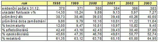 Podíl redaktorů na celkovém stavu zaměstnanců opět stagnoval a dosáhl počtu 64,95.