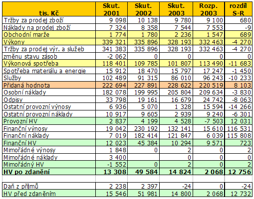 Na vytvořeném zisku se provozní a finanční hospodářské výsledky podílely zhruba v poměru 1:2. Přes pokračující pokles tržeb a nárůst osobních nákladů se podařilo dosáhnout nejlepšího provozního HV za poslední tři roky. Zasloužily se o to úspory nákladů, především pokles spotřeby materiálu a energie, služeb, odpisů a lepší rozdíl ostatních provozních výnosů a nákladů. Paradoxní situaci, kdy zisk před zdaněním je nižší než zisk po zdanění, způsobila skutečnost, že daň z příjmů splatnou jsme neměli v roce 2003 žádnou a odložená daň se snížila o 24 tis. Kč.