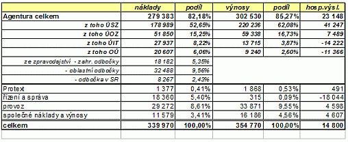 Podíl jednotlivých činností na nákladech a výnosech ukazuje následující tabulka: