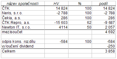 Z tabulky je zřejmé, že výsledky jednotlivých společností jsou velmi rozdílné. Největší měrou se na ziskovosti celku podílely mateřská společnost ČTK a Newton IT.