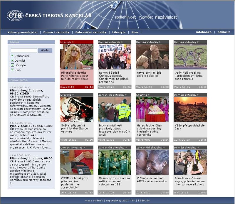 Videozpravodajství ČTK obsahuje hotové reportáže i hrubé materiály připravené k dalšímu zpracování. Klienti si mohou vybrat z formátu uložených v PAL (tv kvalita), formátů pro internet, PDA i mobilní telefony.