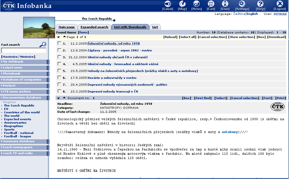 The Collected European Union Database - this collected and constantly updated database includes text, info-graphic and photographic production from CTK and a number of important external sources dealing with the European Union. It includes fresh information with solid facts and historical foundations. The database also includes links to websites dealing with certain problems.